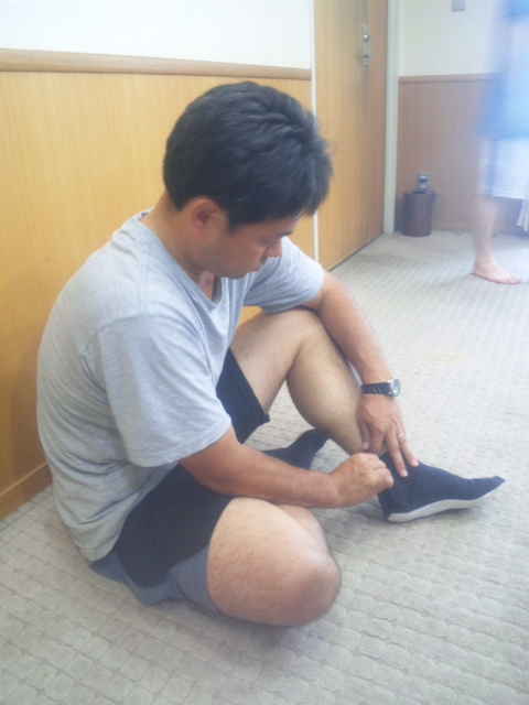 着付けの前に足袋を履く、制裁編・小村役の上野(うわの)敏明さん。