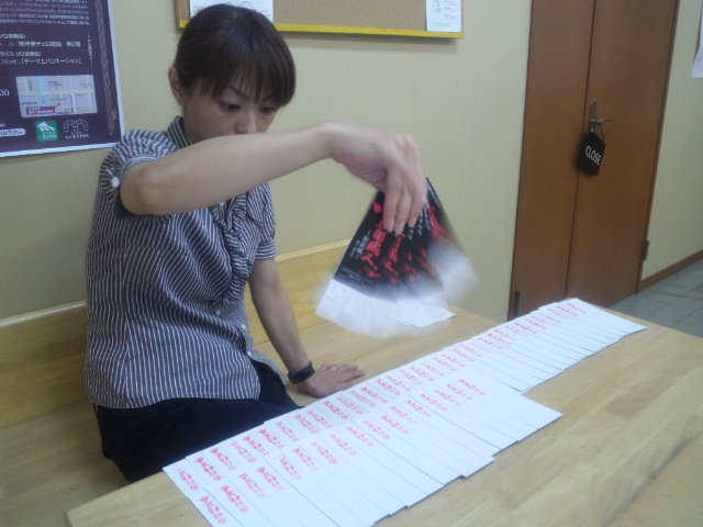 チケットの裏に押したハンコのインクを、いっしょうけんめい乾かしている『芦澤ねぇさん』こと芦澤志帆子嬢(高砂屋編・お豊役)。