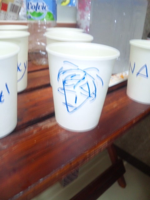 紙コップにはそれぞれ名前なり何なりを記入することになっているのですが...これは誰の紙コップ?