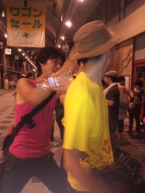 終演後、劇場近くのアーケード街で、もういちど段取りを確認する熊谷氏&川村英(制裁編・高砂屋役)氏。