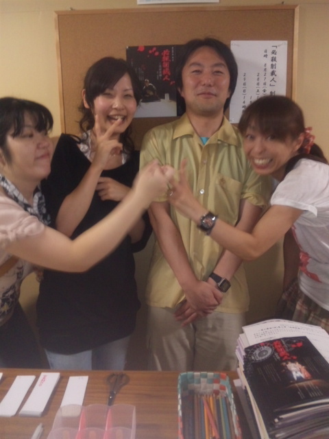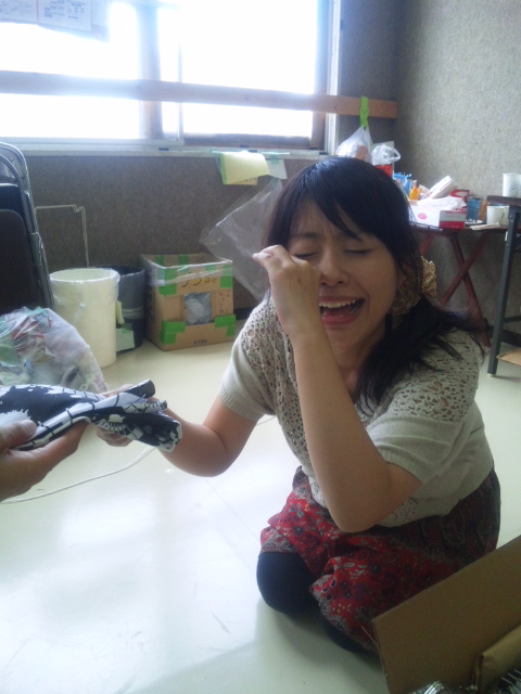 写真は、グッズ担当まさやようこ嬢、手ぬぐいの出来上がりのすばらしさ&手ぬぐいを買ってもらえた嬉しさに感涙を抑えられない、の図。