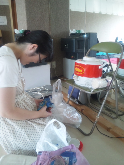 さて、稽古場の片隅では、池田Pが布の上で作業中。