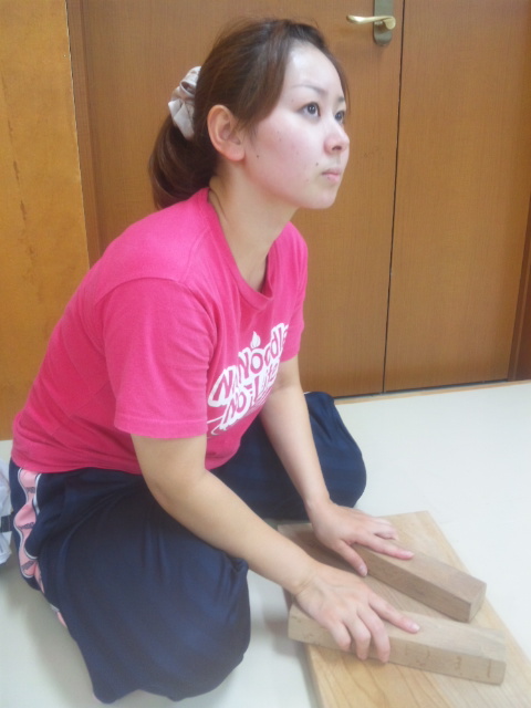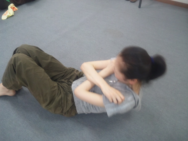 いっしょうけんめい腹筋をする小萩嬢(制裁編・お奈津役)。