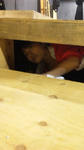 台組の下にスルリと入り込み、作業するまさやさん。