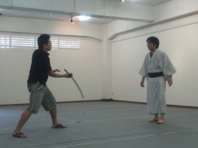 鷲之介役・やすくん(菅原康幸氏)が、演出エンドゥ氏から刀の振り方について指導を受けている真っ最中。